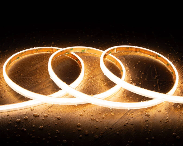A Fita LED 24V COB 320 LED/m 5m 10W/m 1000lm/m IP65 CRI90 6000K oferece iluminação contínua e uniforme graças à tecnologia COB, sem pontos visíveis de luz.